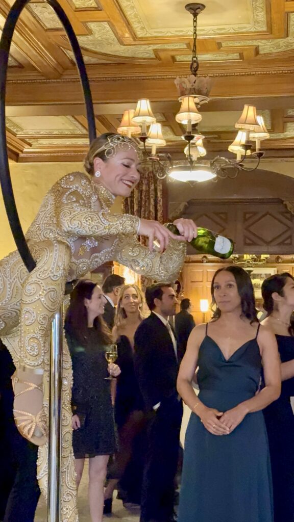 This impressive aerial act requires some type of rigging. We have freestanding rigs that will fit most venues. Picture an aerialist greeting your guests upon entry or pouring your guests bubbly from the sky as an aerial bartender.