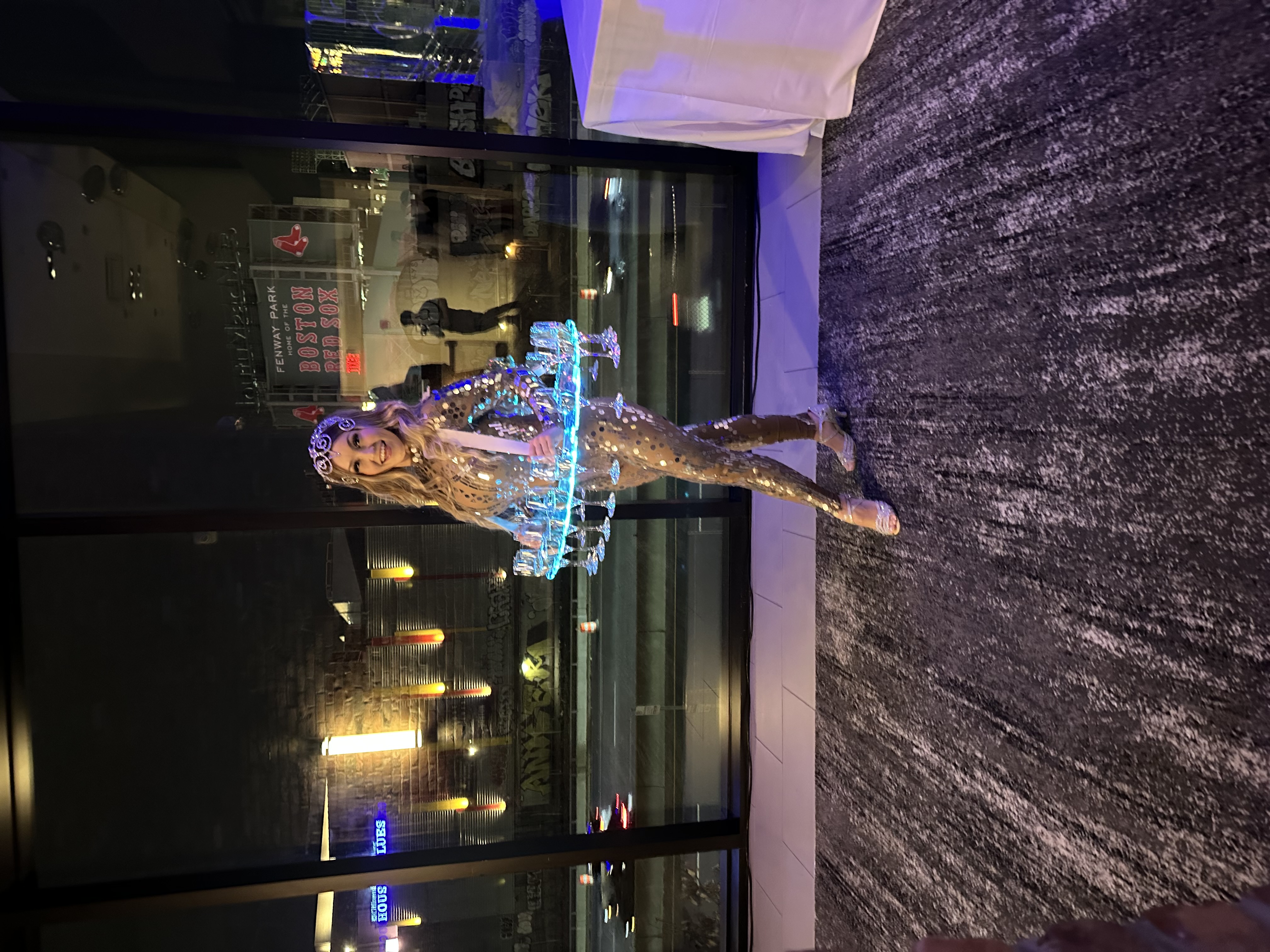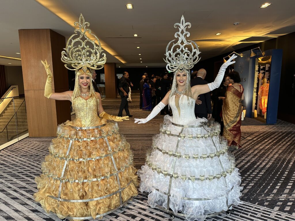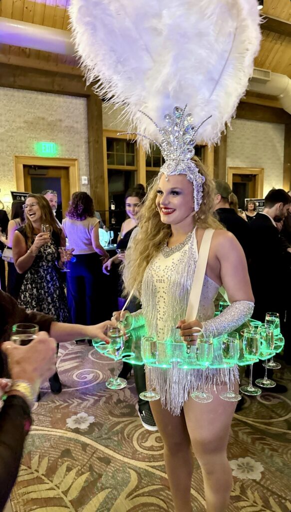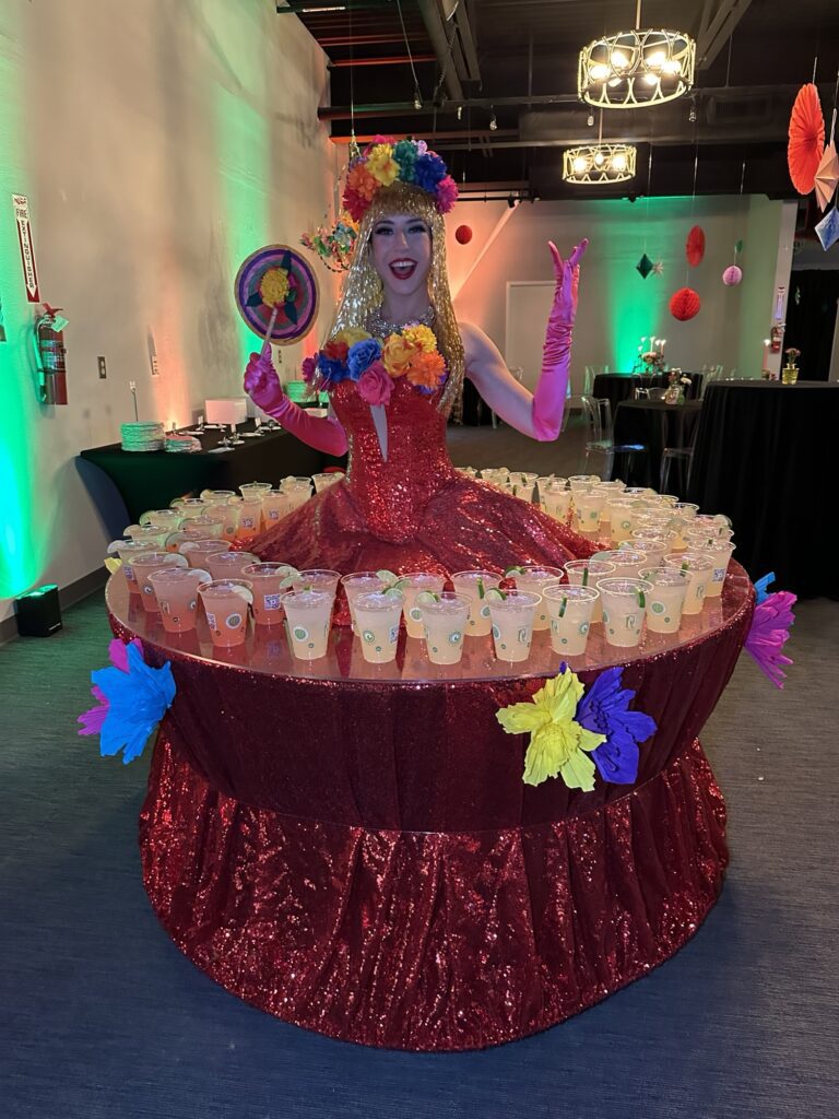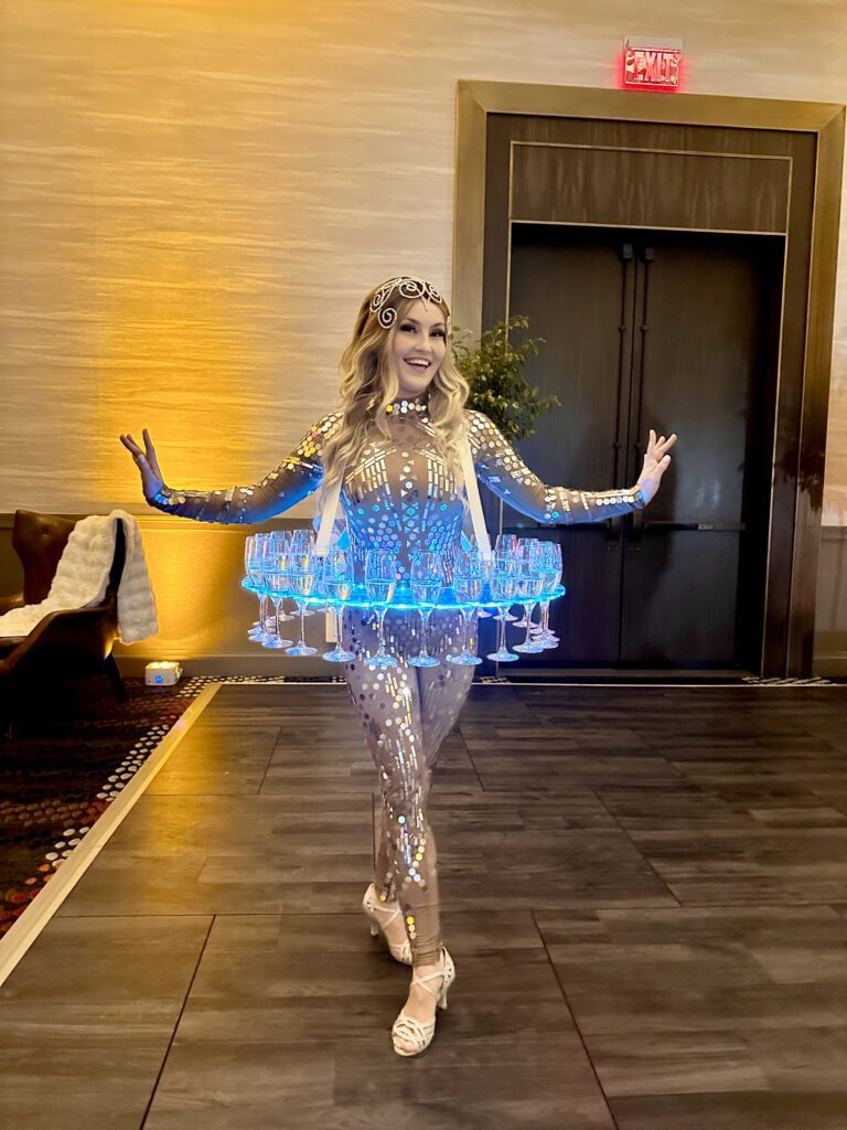- Strolling Champagne Skirt – Your guests can pick a glass of your favorite bubbly right off our performers glass holder dress! Dress holds 90 glasses of champagne.